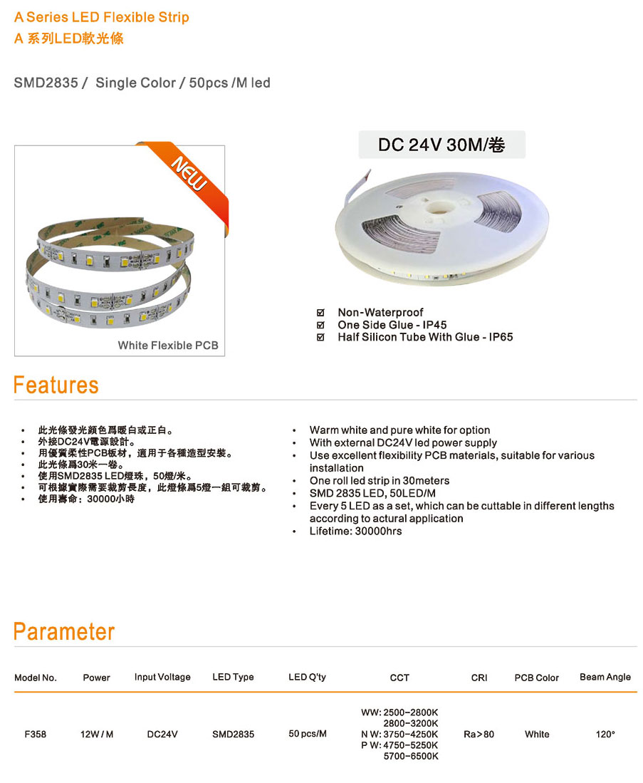 - 產品名稱: A系列 SMD2835 單色 LED軟燈條 50燈/米