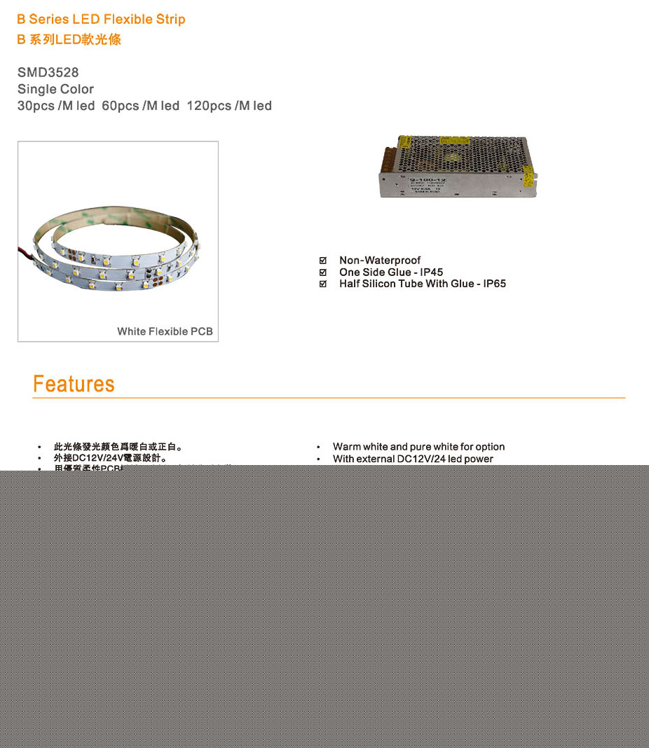 - 產(chǎn)品名稱: B系列 SMD3528 單色 LED軟燈條 30、60、120燈/米