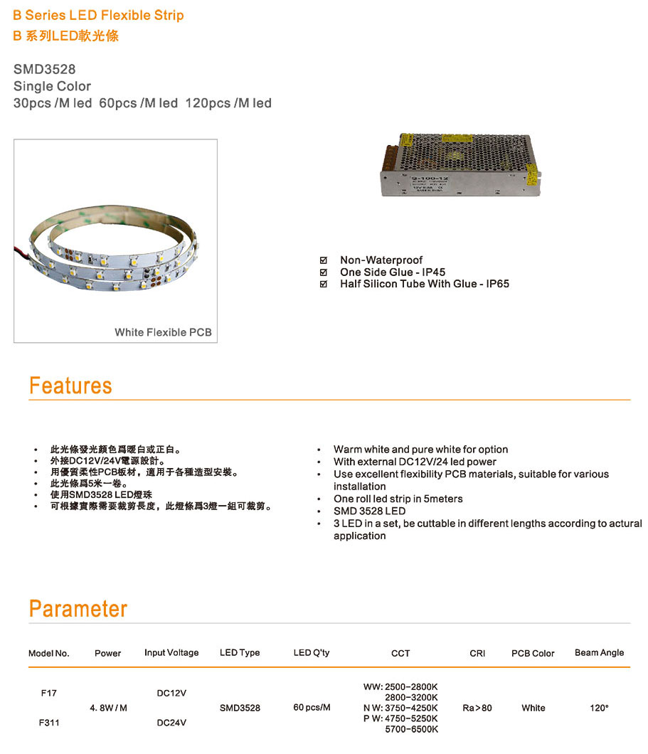 - Product Name: B Series LED Flexble Strip,SMD3528,Single Color,30、60、120Lamp/M